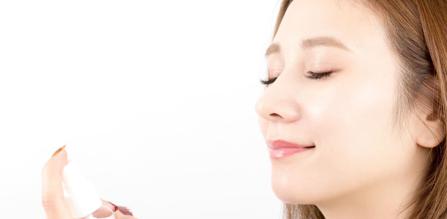 - 顔から15~20cmほど離し、目と口を閉じて、適量(3~4プッシュ)をお肌に直接スプレーします。